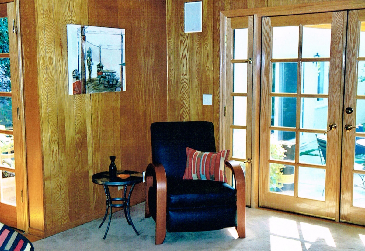 This bachelor wished to update his monochromatic living room and adjoining hallway/storage area. He wanted to preserve the paneling and carpet, as well as some items of sentimental value, such as the decoupage end table and Beatles needlepoint.